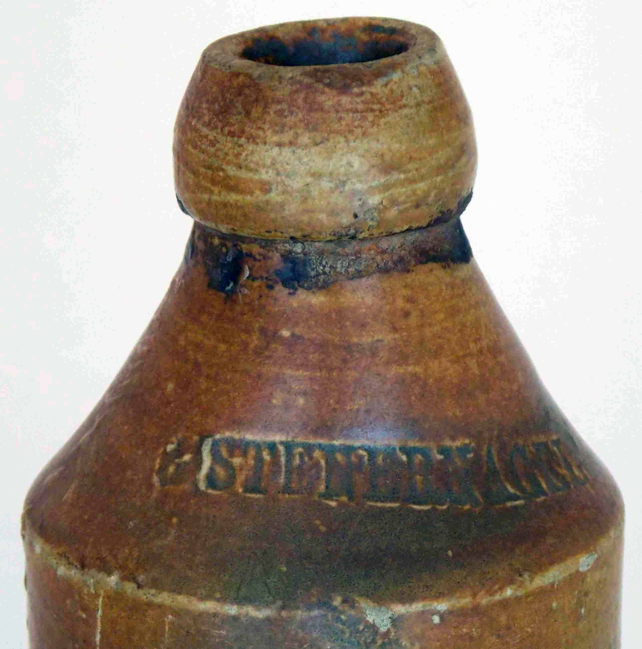 book # 148 (in the Stoneware section) This is a 7" tall stoneware blob-top bottle with a name impressed in the shoulder: imprinted on shoulder: G STENERNAGEL The 'G' is feint and might just be a smudge or defect. A common spelling error is to mistake a 'u' for an 'n' when you're reading a hand written name, which I beleive is why it has an "N" where a "U" should be. The seller of this bottle said it was dug at a construction site on Braddock Road in Alexandria. war". |