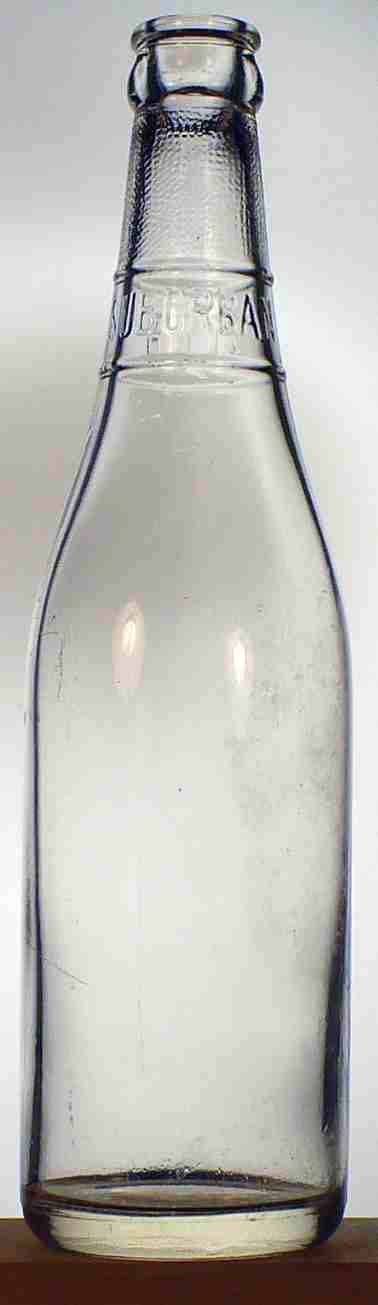 book # (unlisted) This is a green 11.25" green machine-made crown top bottle embossed: around heel: SUBURBAN CLUB WASHINGTON 28 FL. OZ. base: ('R' in a triangle) / S C / Z34 7 Note that this bottle says "WASHINGTON" but not "D.C.". Suburban Club was local to Washington DC and Maryland, so it's unlikely this bottle was from any city named "Washington" other than D.C. |