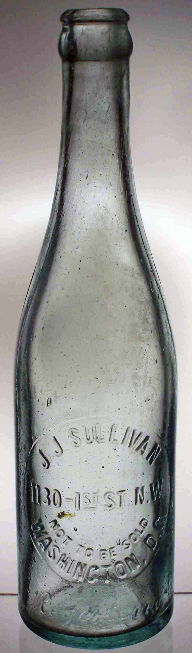 book # 671 This is a 9.25" aqua crown top bottle embossed: round slug plate: J.J. SULLIVAN / 1130-1ST ST. N.W. / NOT TO BE SOLD / WASHINGTON, D.C. below slug plate in script: Registered base: W / V G Co |
