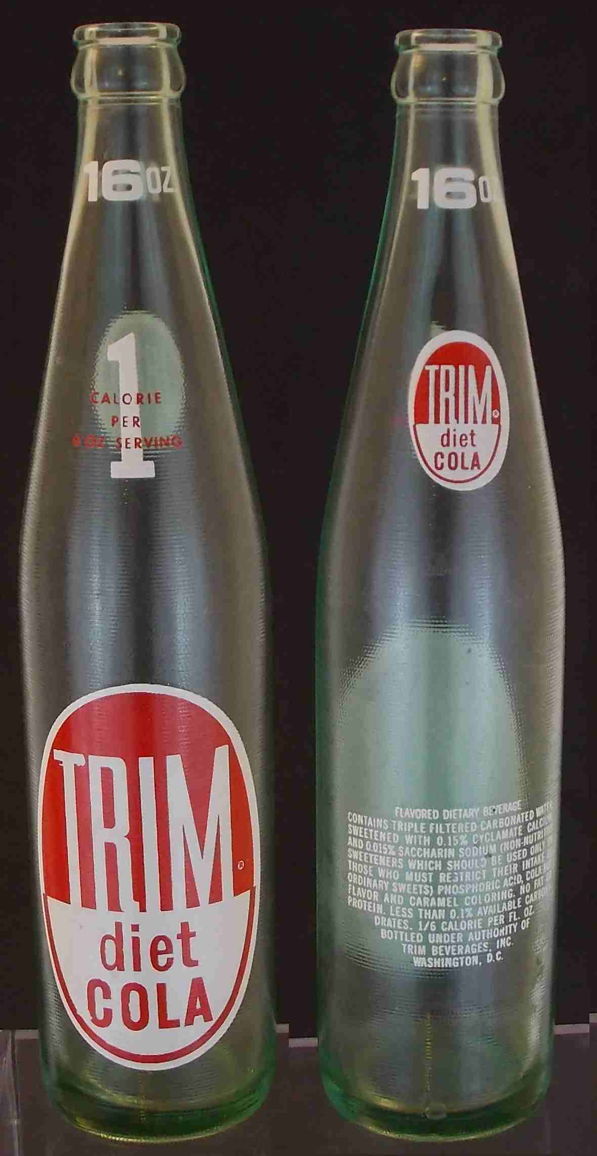 book # 682 This is a stipled, aqua 11.1" crown-top bottle with a red and white applied color label: front shoulder: 16 OZ / 1 / CALORIE / PER / 6 OZ. SERVING shoulder: TRIM / diet / COLA rear shoulder: 16 OZ / TRIM / diet / COLA rear: FLAVORED DIETARY BEVERAGE / CONTAINS ... / BOTTLED UNDER AUHTORITY OF / TRIM BEVERAGES, INC. / WASHINGTON, D.C. embossed on base: G20031 30 63 |