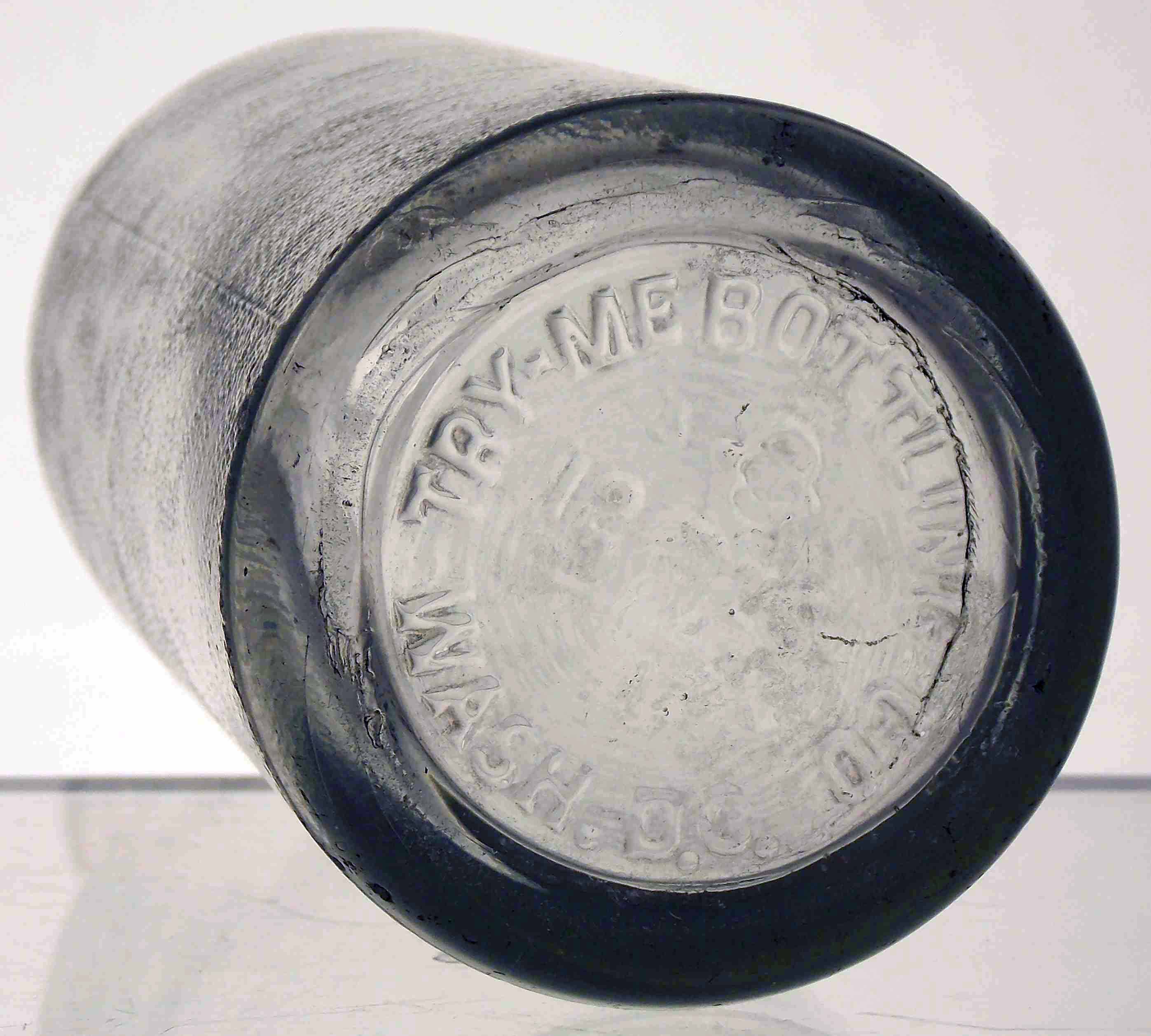 book # (unlisted) This is a 9.75" clear machine-made crown top bottle. It is stipled, and embossed: around the shoulder: T M B Co base: TRY-ME BOTTLING CO / 12 OZS / WASH. D.C. |