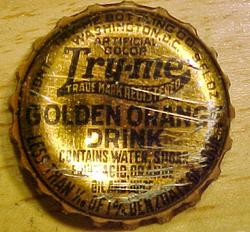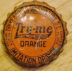 book # 694 This is the same as the bottle above except that the ACL is orange & white (instead of black & white). It's an 8" crown top (front & back shown) marked: front: PURE WHOLESOME / DRINK / Try-me / TRADE MARK REG. / BEVERAGES / DELICIOUS REFRESHING back: MADE WITH / FILTERED CARBONATED WATER / AND SWEETENED WITH / PURE CANE SUGAR / FLAVOR DERIVED FROM NATURAL / FRUITS AND OILS -- FRUIT ACIDS -- / CERTIFIED COLOR ADDED / CONTENTS 12 FL. OZ. / BOTTLED BY / THE TRY-ME BOTTLING CO. / WASHINGTON, D.C. embossed on base: THE TRY-ME BOTTLING CO. / 467B9 |