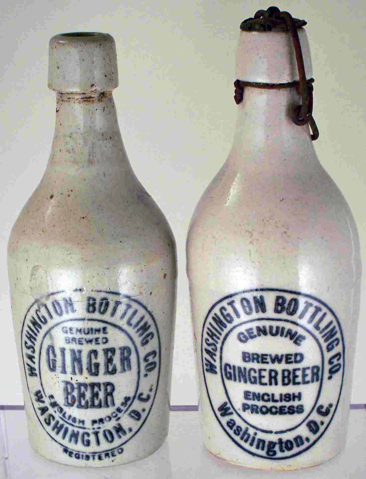 book # 162 (in the 'stoneware' section) These are both 7.25" stoneware bottles. The one on the right still has it's wire metal stopper. Both are marked: front: WASHINGTON BOTTLING CO. / GENUINE / BREWED / GINGER / BEER / ENGLISH PROCESS / WASHINGTON, D.C. / REGISTERED |