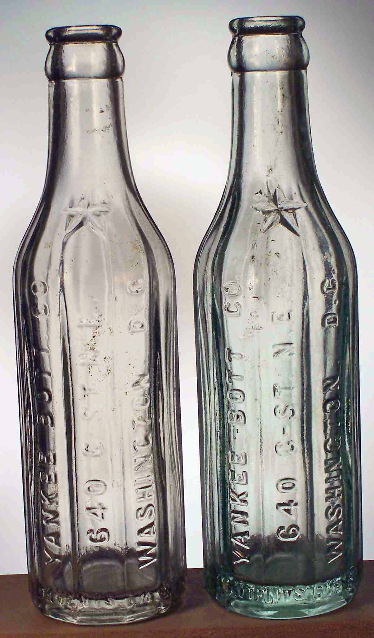 book # 726 These are 8" deco machine-made bottles embossed: front/back shoulders: (star) front vertical: YANKEE BOTT. CO. / 640 C-ST. N.E. (star) / WASHINGTON, D.C. front horizontal: CONTENTS 6 1/2 OZ. back horizontal: THIS BOTTLE NEVER SOLD base: D.O.C. 252-2 The left one is clear; the right one is aqua, and differs in that the base embossing says "D.O.C. 252-1". |