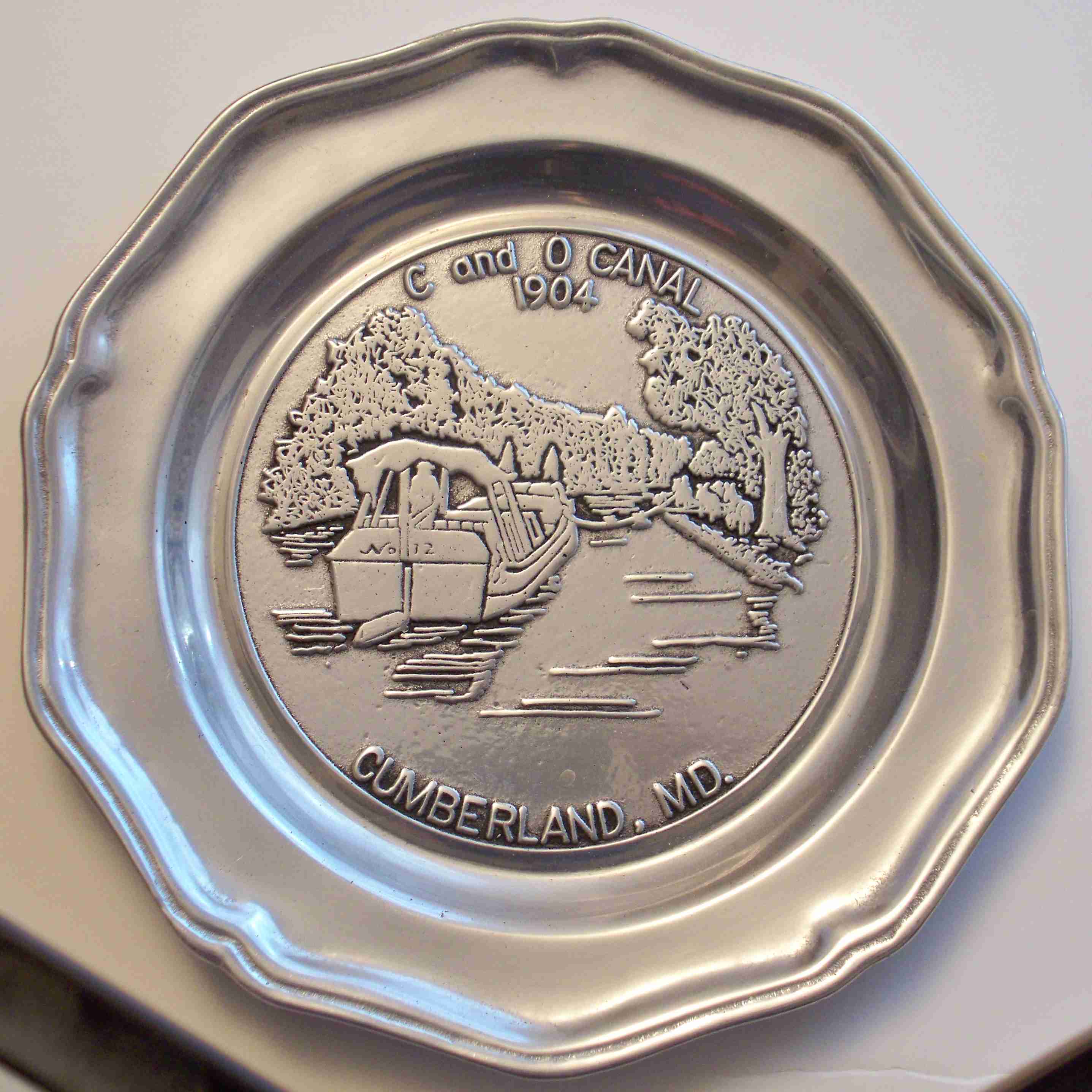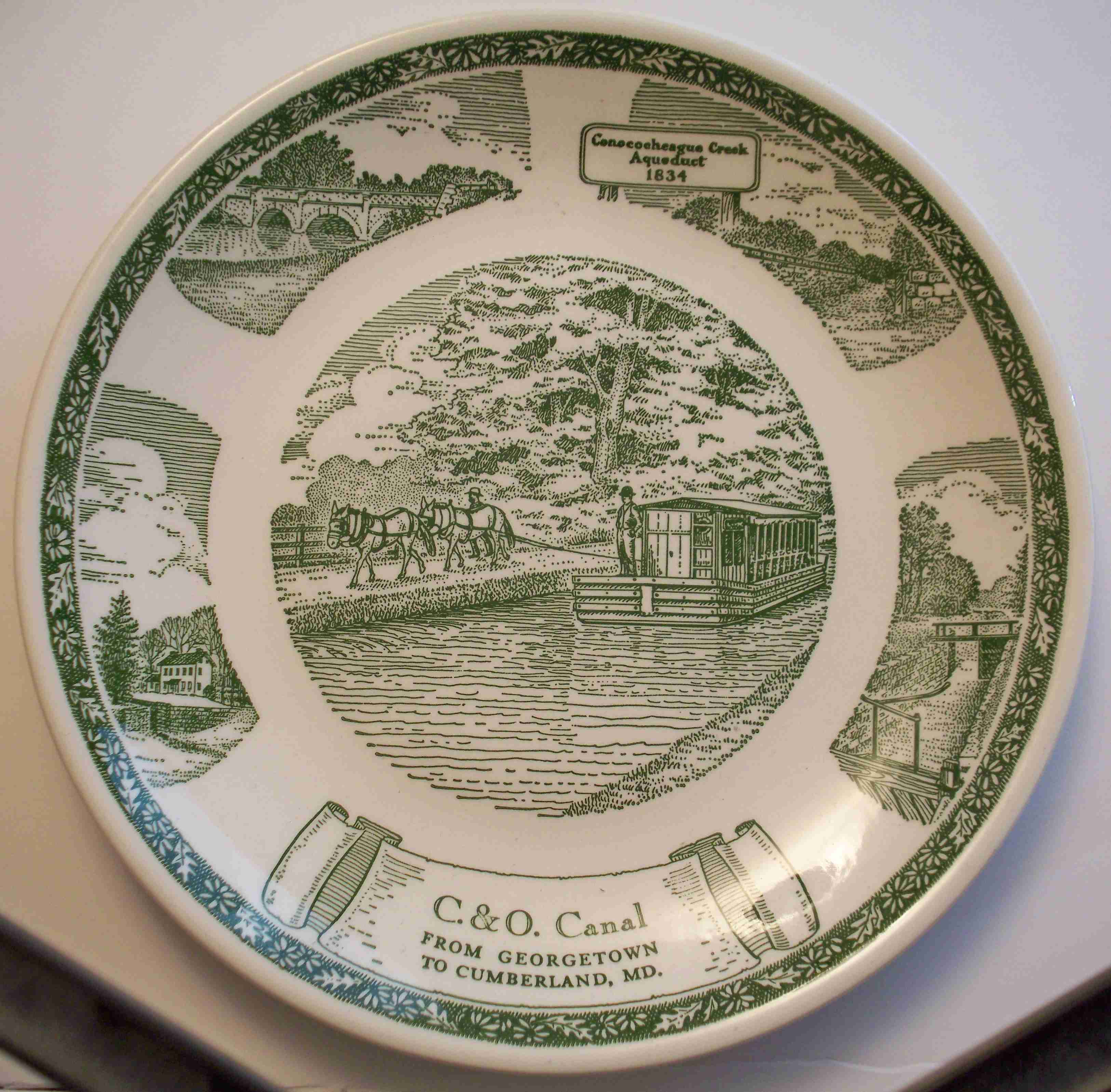 This is a 10" diameter white ceramic plate with green printing. On the back it says