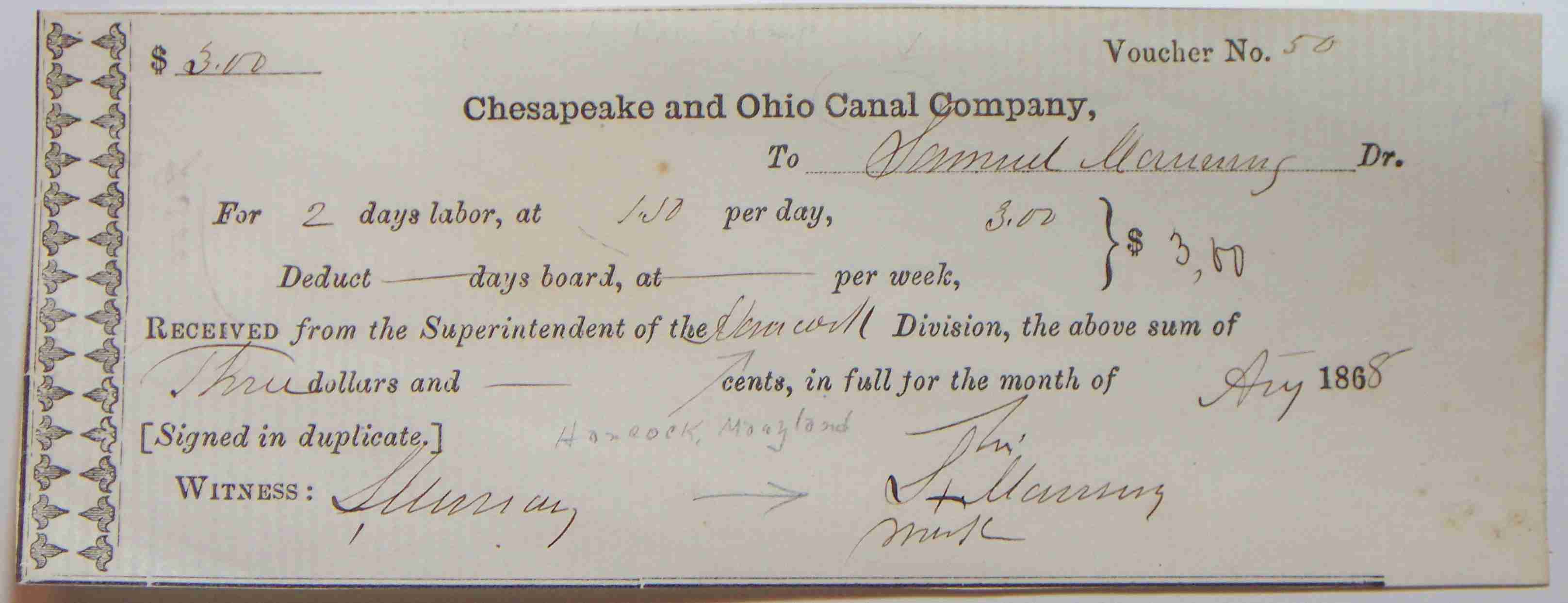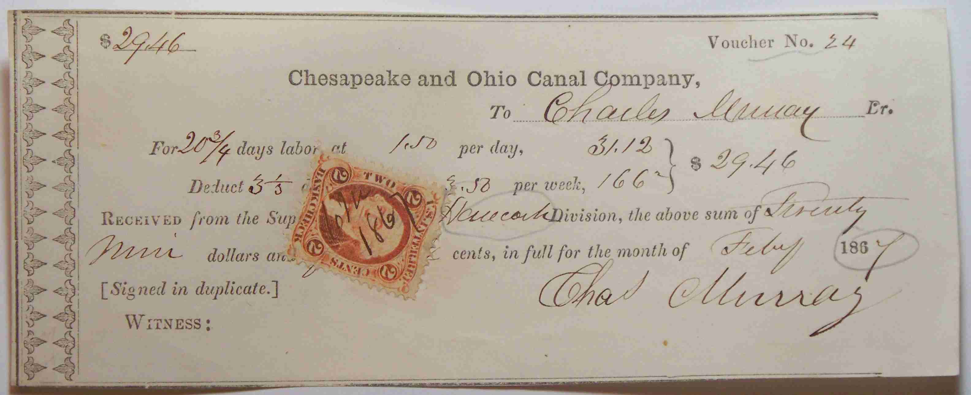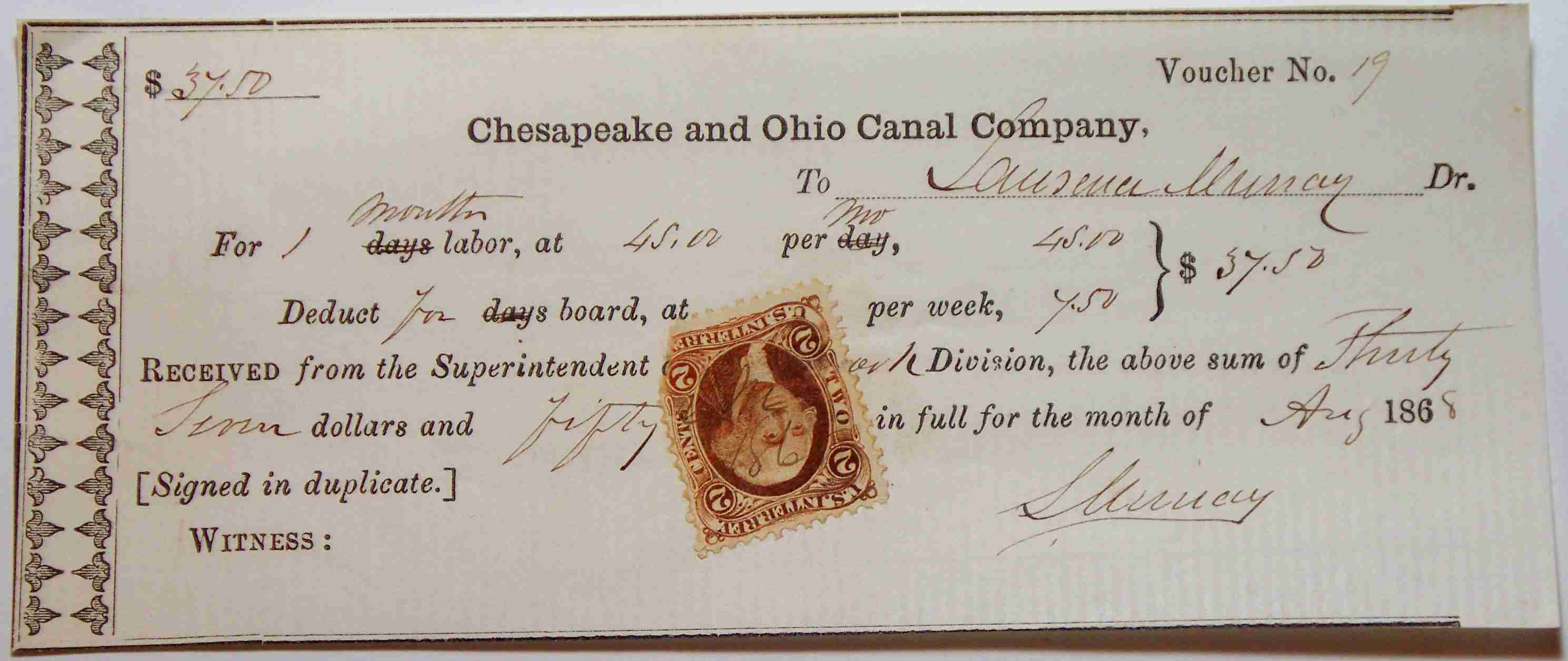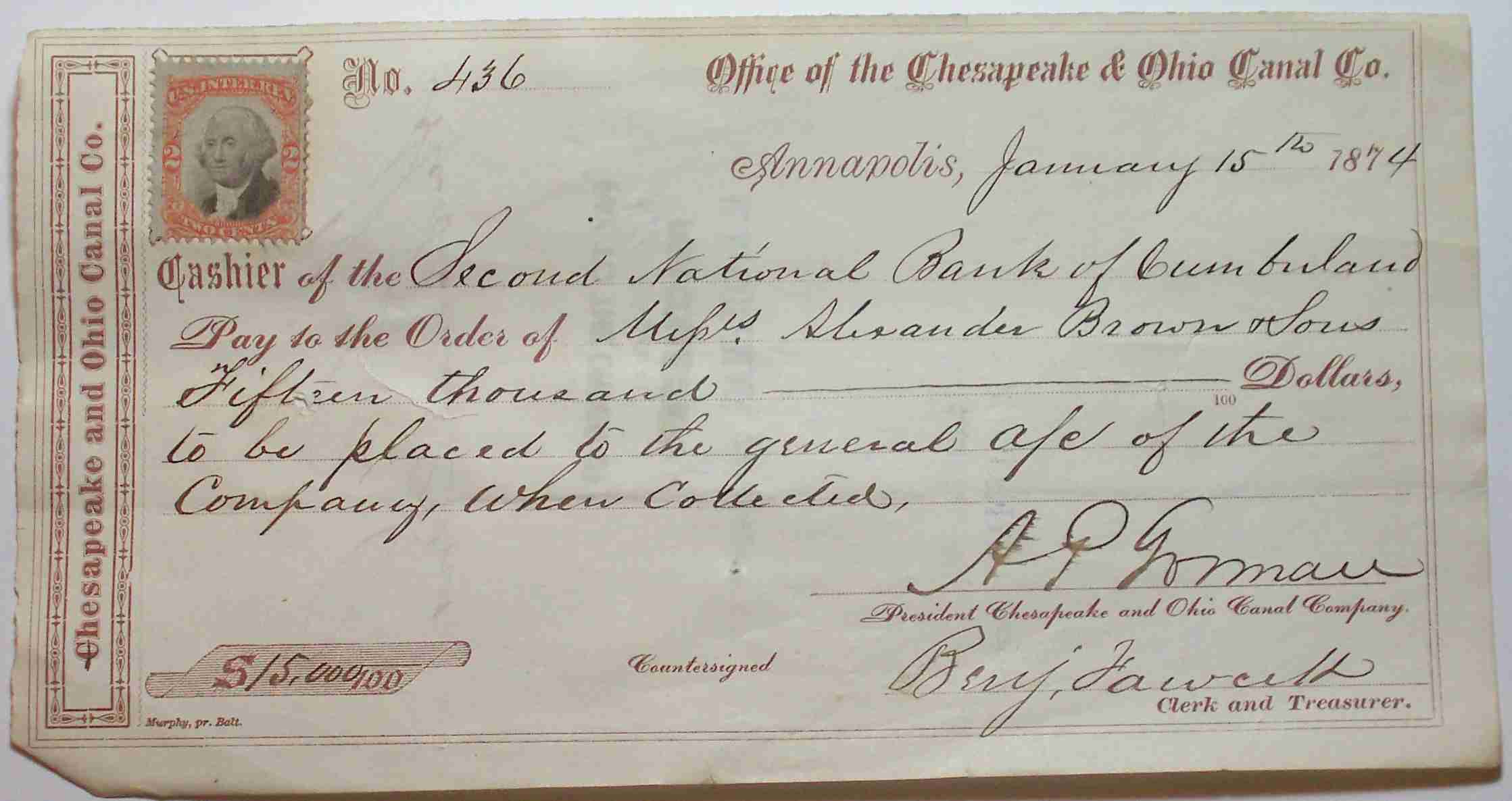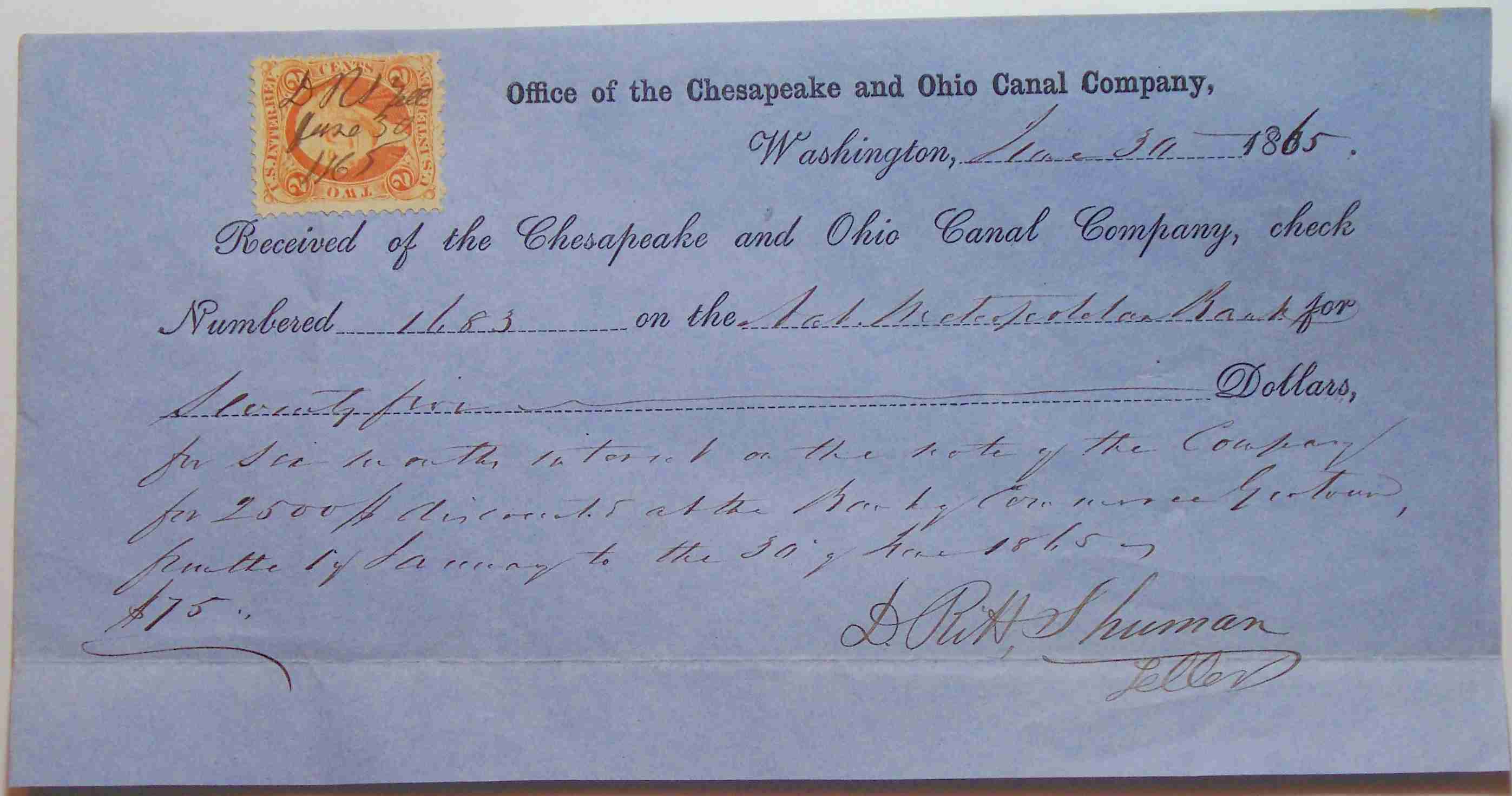 Received of the Chesapeake and Ohio Canal Company, Check