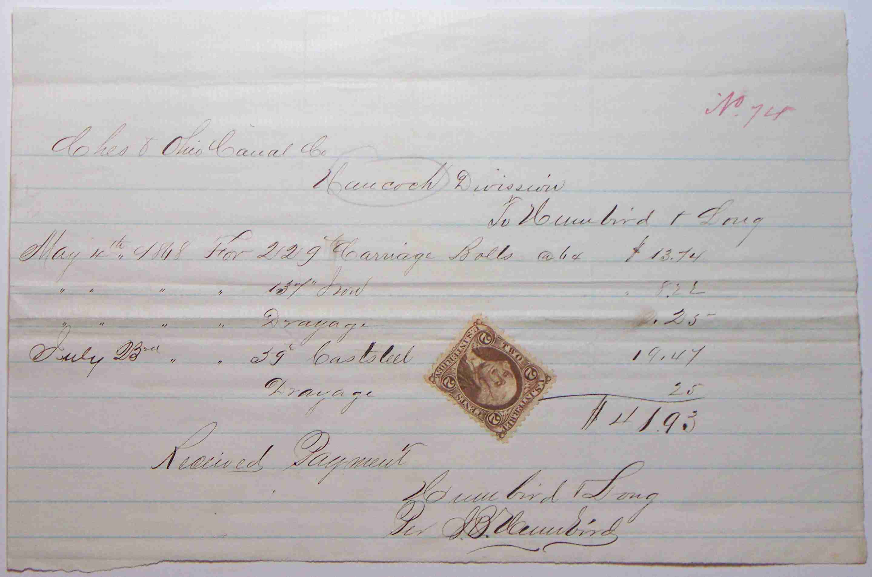 May 4th 1868 for 229 Carraige Bolts @ 6c $13.74