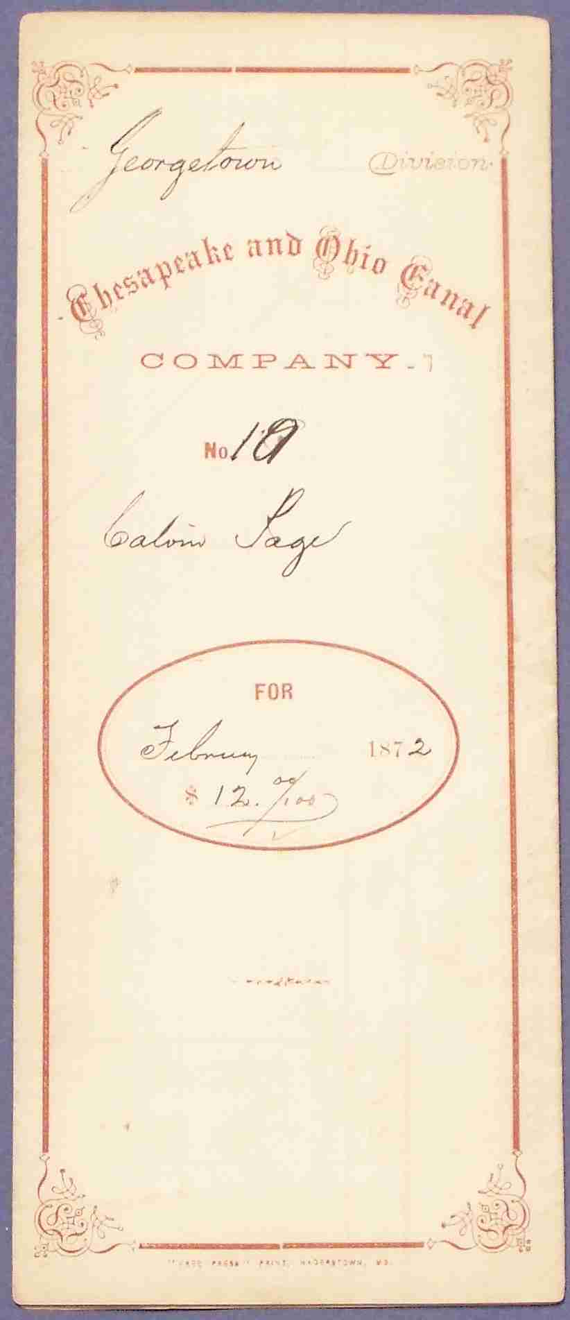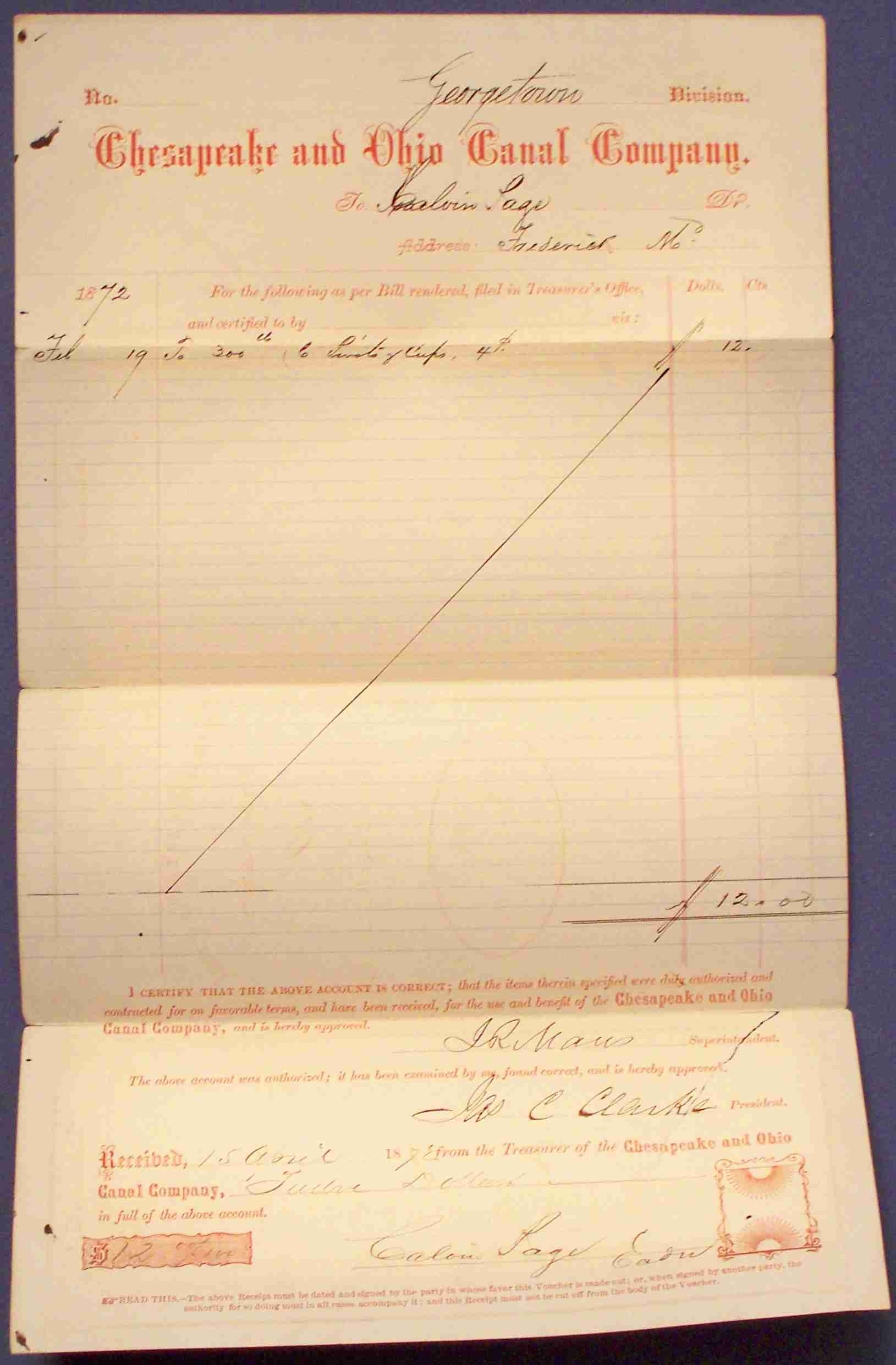 This is a folded-up receipt from the Georgetown division of the Chesapeake and Ohio Canal Company,