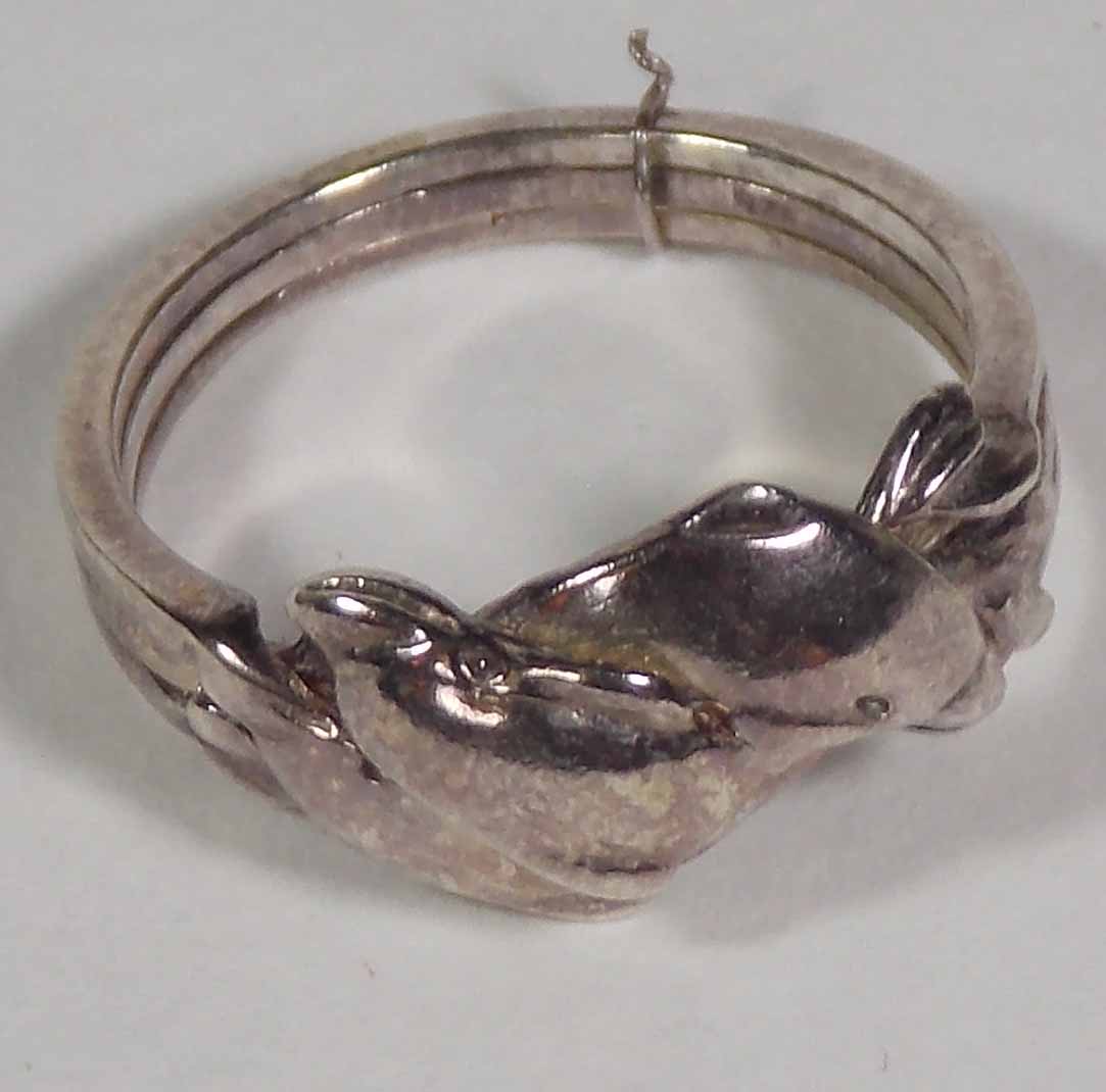 Dolphin Puz. Ring | Puzzle Makers Int | Ring made of 4-pieces of metal with dolphins on face |