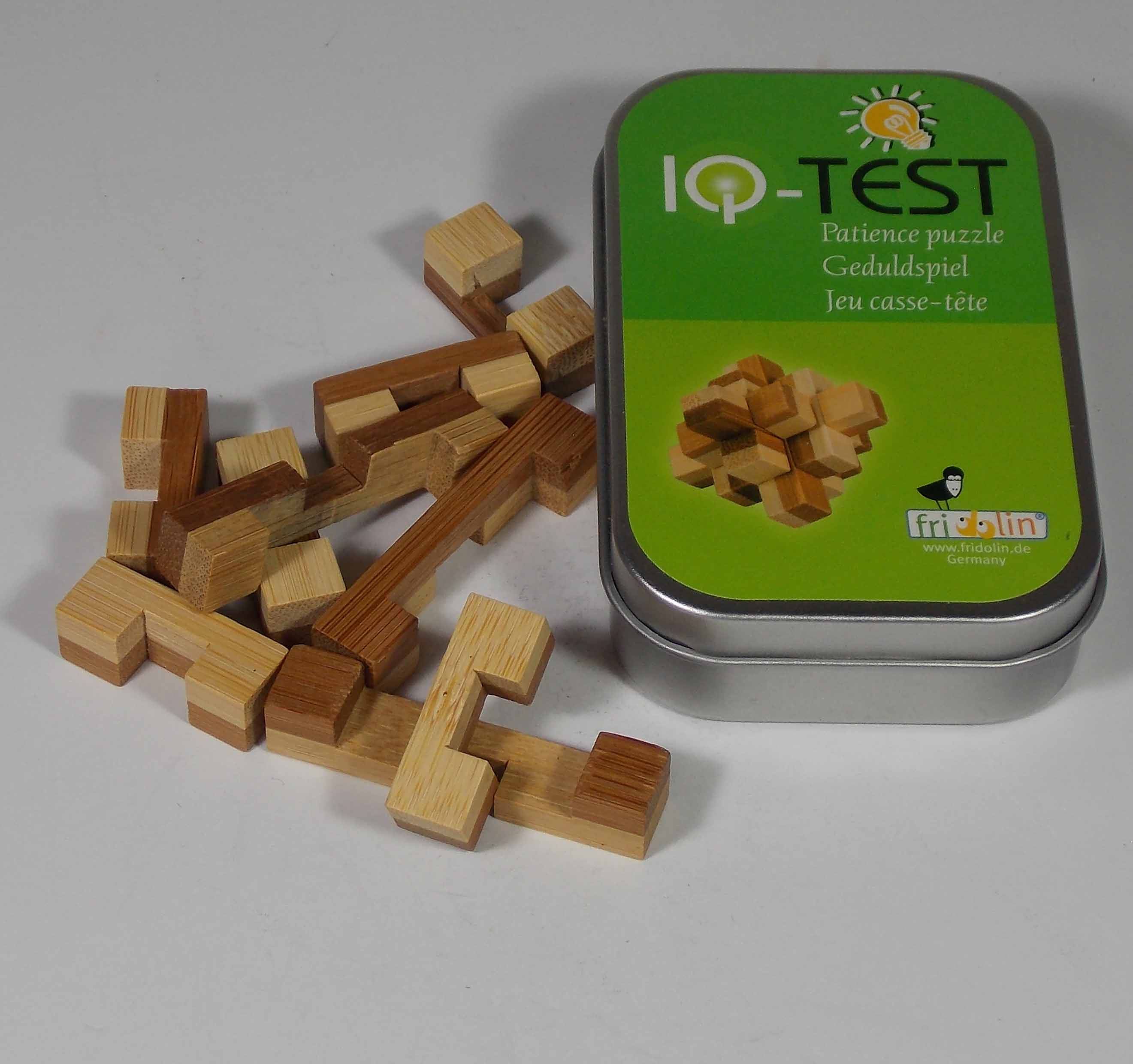 IQ-TEST Patience | www.fidolin.de | 9 piece wooden burr in a sardine-can |