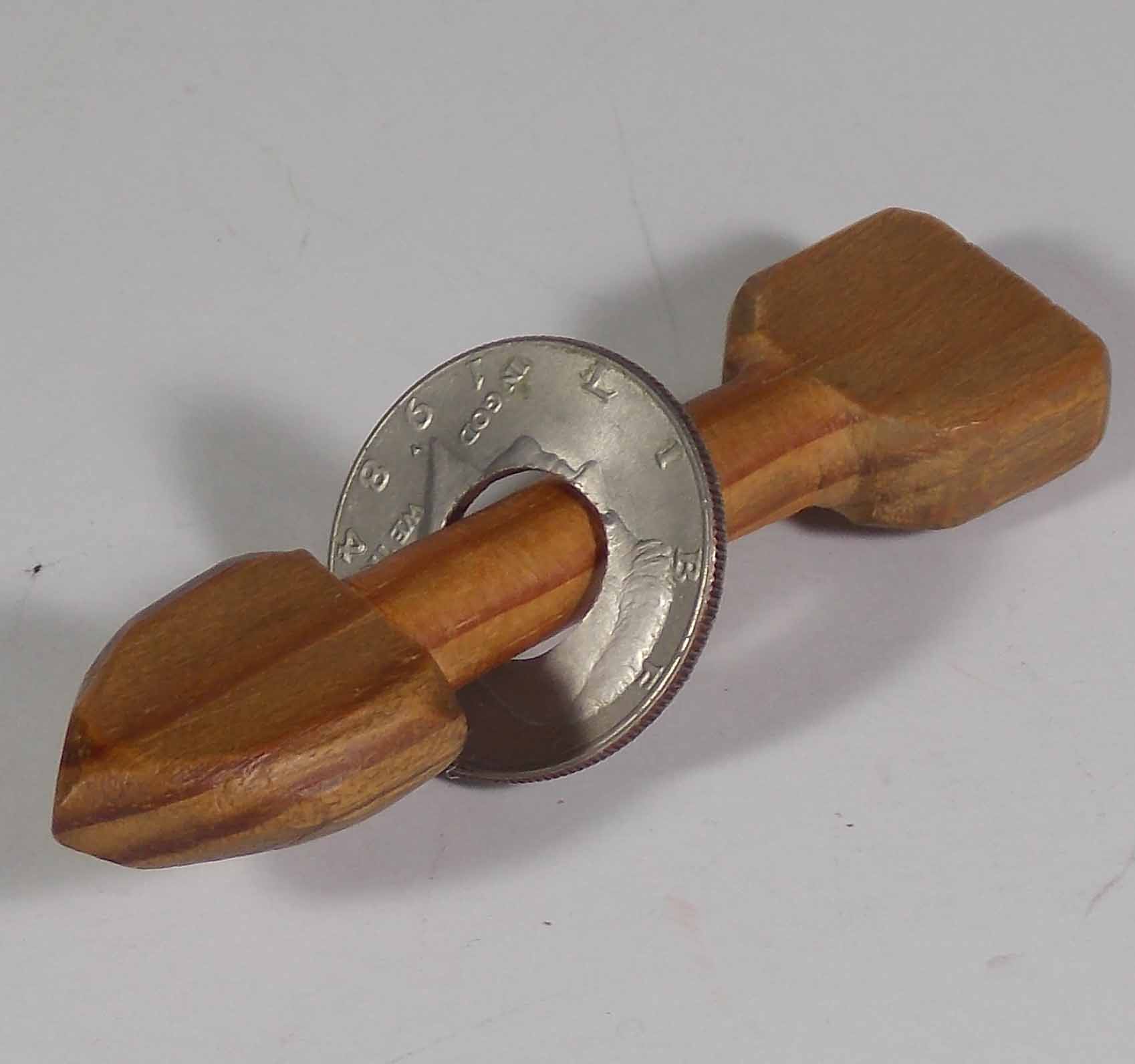 (arrow thru coin) | (home-made) | Arrow made of solid wood, through coin with hole drilled in it |